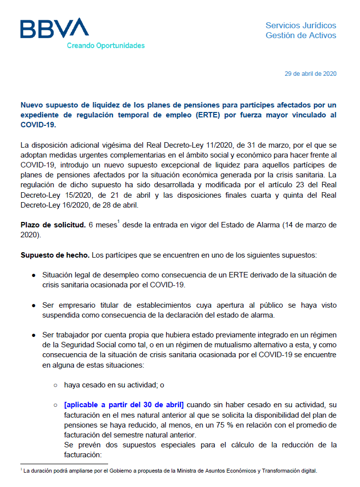 La disposición adicional vigésima del Real Decreto-Ley 11/2020, de 31 de marzo, por el que se adoptan medidas urgentes complementarias en el ámbito social y económico para hacer frente al COVID-19, introdujo un nuevo supuesto excepcional de liquidez para aquellos partícipes de planes de pensiones afectados por la situación económica generada por la crisis sanitaria. La regulación de dicho supuesto ha sido desarrollada y modificada por el artículo 23 del Real Decreto-Ley 15/2020, de 21 de abril y las disposiciones finales cuarta y quinta del Real Decreto-Ley 16/2020, de 28 de abril.