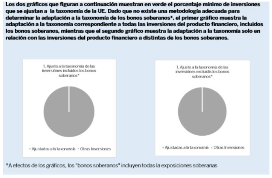 Las inversiones sostenibles podrán contribuir a una o varias actividades económicas consideradas medioambientalmente sostenibles de acuerdo con la taxonomía de la UE. En particular, dichas inversiones podrán tener como objetivo la mitigación del cambio climático o la adaptación al cambio climático. El porcentaje mínimo de alineación de las inversiones del Plan a la taxonomía de la UE es del 0%.