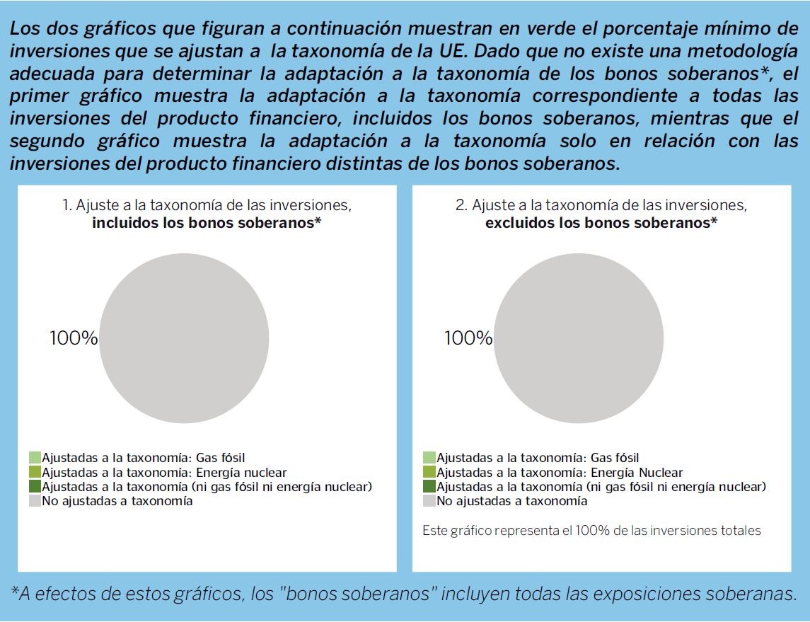 Por otro lado, el Fondo no tiene ningún compromiso de realizar inversiones sostenibles al amparo del artículo 2.17 de SFDR y, por tanto, tampoco de invertir en inversiones sostenibles ajustadas a la taxonomía de la Unión Europea.
